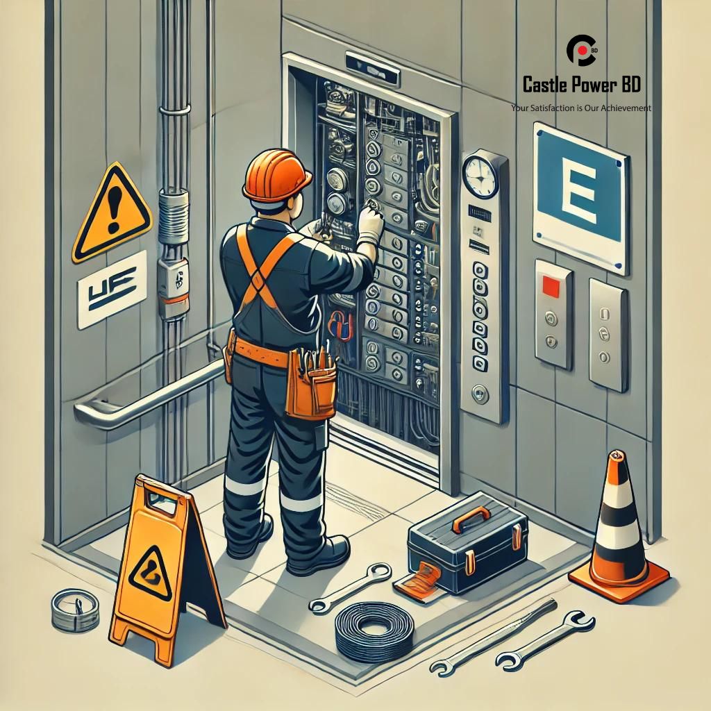 "Technician performing routine maintenance on an elevator system, ensuring safety and efficiency by inspecting and repairing key components inside the elevator shaft."